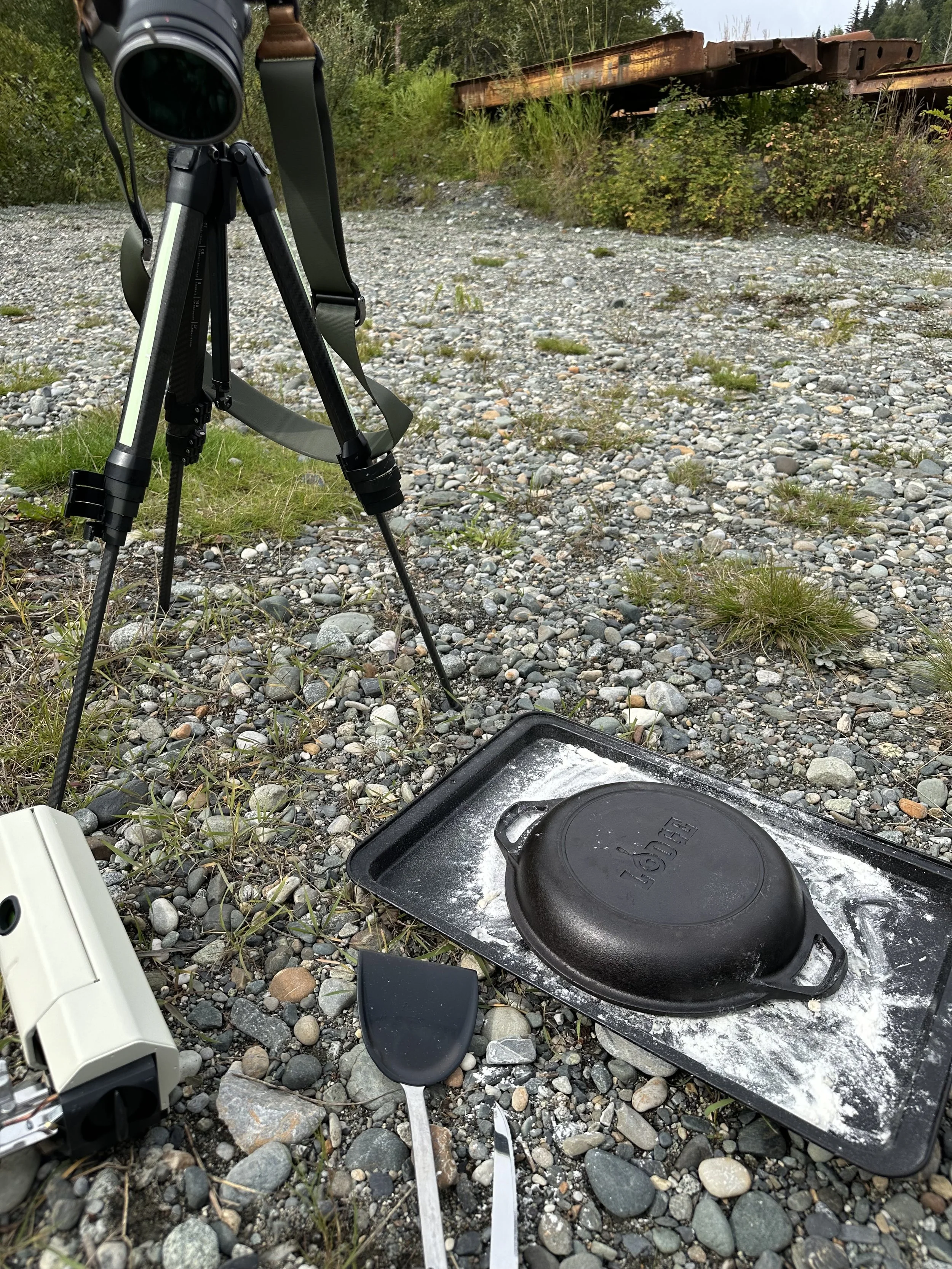 I set up my camera to do several time lapse videos of the action. You’ll see these after I get home. I’m just seeing the results now. Pretty fun. Since a time lapse you guessed it, time, I made a simple breakfast. Tea and porridge today from boiling water out of the lake.