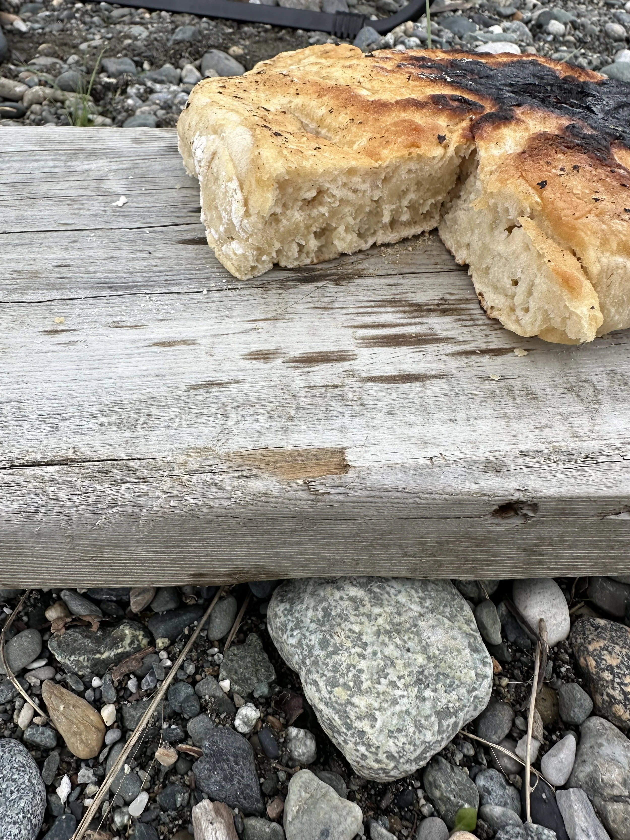 I stopped by an emerald green pond to take pictures. I was carrying a large ziplock bag of bread dough. A friend had mentioned baking pizza. Last night I thought I would like English muffins in the morning. With some flour, salt, yeast and water I made the dough and left it safe from bears, to rise in the car. This morning had skies still full of rain and I left the dough. Now that I was in such a pretty spot, I baked out the dough. To keep things easy I made one big blob of bread. It was pretty good, especially eaten outdoors in Alaska. It vanished while hot. I continued North crossing back into Canada. The scenery grew ever more beautiful so I found a spot off the highway to camp for the night.
