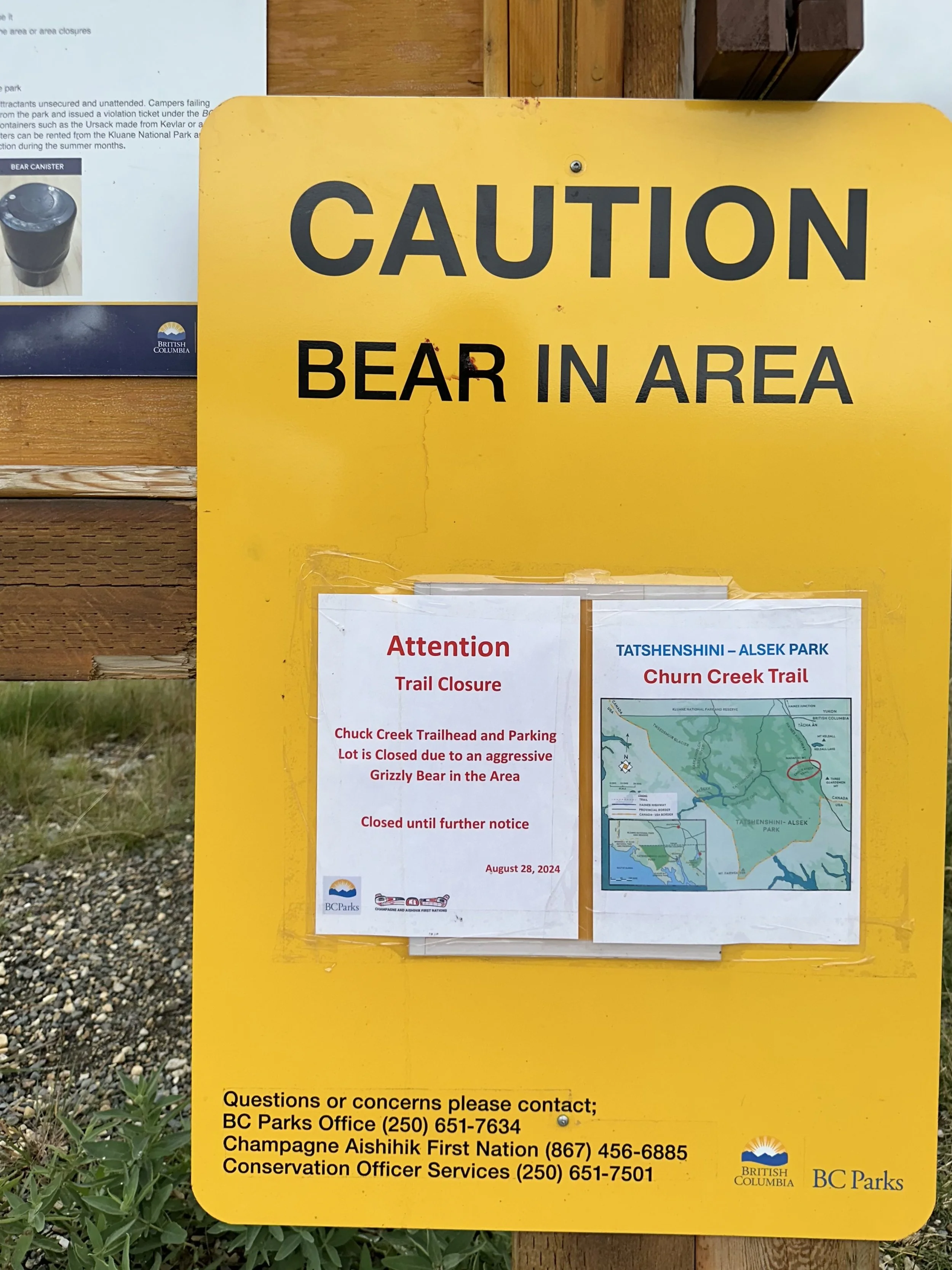 I had parked up at the summit of the Haines highway. Now, descending the inland side, the mists opened to a massive scenery. Empty. Huge mountains pushed away from the glacial trough where I was driving. The traffic report was 2 cars an hour, one in each direction. Posted speed 90kms, my speed 50kms. Neck acquired frequent swivelling stress. In other words, perfect bliss. I pulled over not far from where I started to discover an aggressive bear, a grizzly, was in the area. Trails were closed, a trap was set.