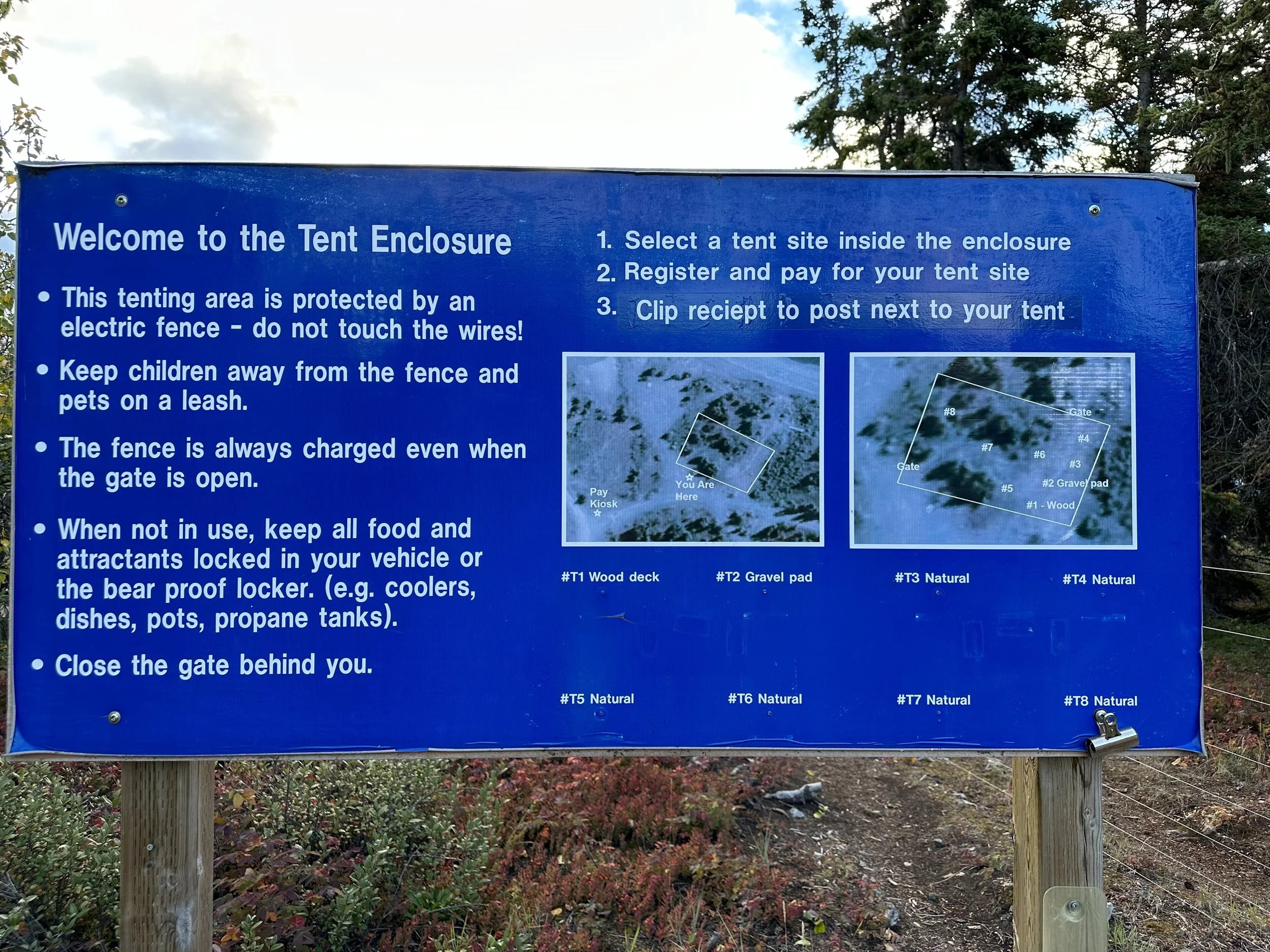 I’m now in Kluane Park, a UNESCO Heritage site, with my tent up. This campground has extra security: an electric fence. It is a favourite trail for the grizzlies. To keep tenters protected we are behind some volts. The RV folks are out there in the wild.