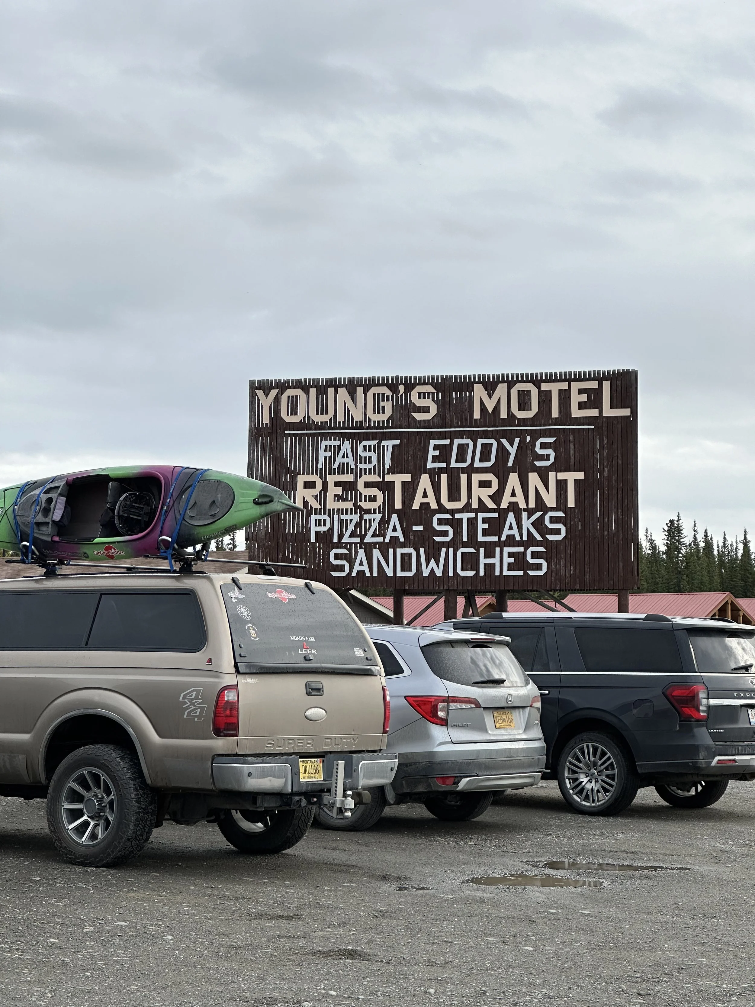 Today I went west to Tok then North on the Taylor Highway aka The Top of the World road. It closes September 15th for the winter. I hadn’t had breakfast. Last night’s hope of a Milky Way or the Aurora was snuffed out with rain the started the moment I zipped up my sleeping bag and stopped an hour before dawn. How perfect is that? Nothing worse than rain when making or breaking camp. I was hungry. Like big breakfast hungry. Hungry enough to forego another bowl of mush. Hungry enough to drive 100kms for a bacon and egg with hotcakes breakfast. With dodging potholes that could eat the Bronze Babe, the drive took nearly two hours. Fast Eddy’s diner looked like the place to go. I had a coffee that tasted like they had brewed all the cig butts from the bar. But the breakfast was wonderful.